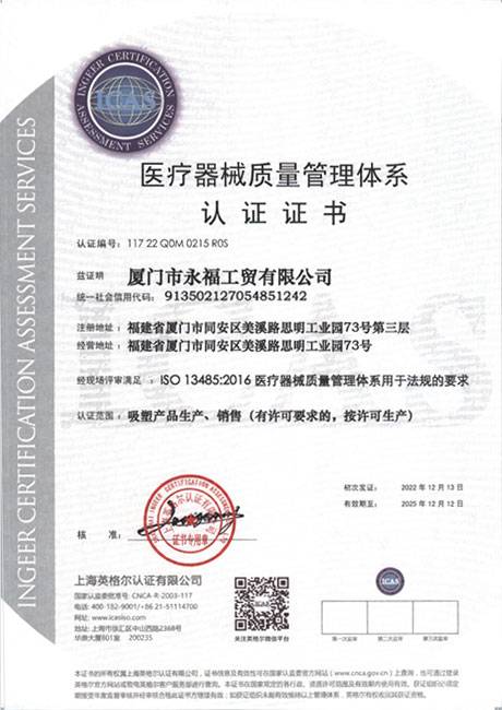 醫(yī)療器械質(zhì)量管理體系認證證書