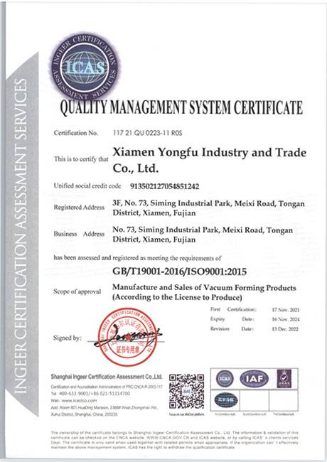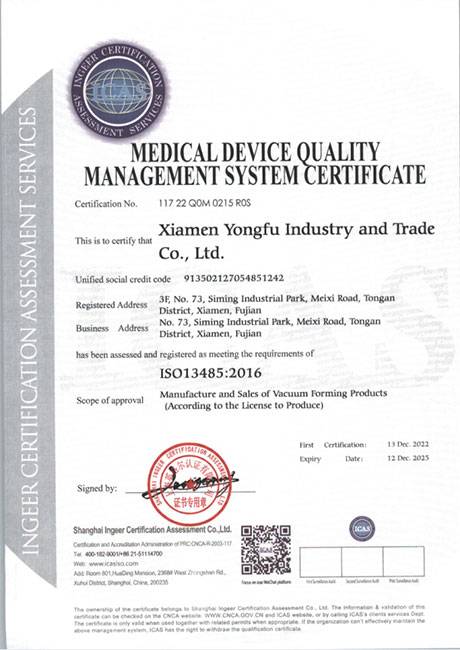 我們通過ISO9001:2015質(zhì)量管理、ISO14001:2015環(huán)境管理體系認證,ISO13485:2016醫(yī)療器械質(zhì)量體系認證,我們在吸塑行業(yè)領(lǐng)先使用萬級無塵車間,整個車間配備中央空調(diào)、防靜電地板、智能換氣設(shè)計。